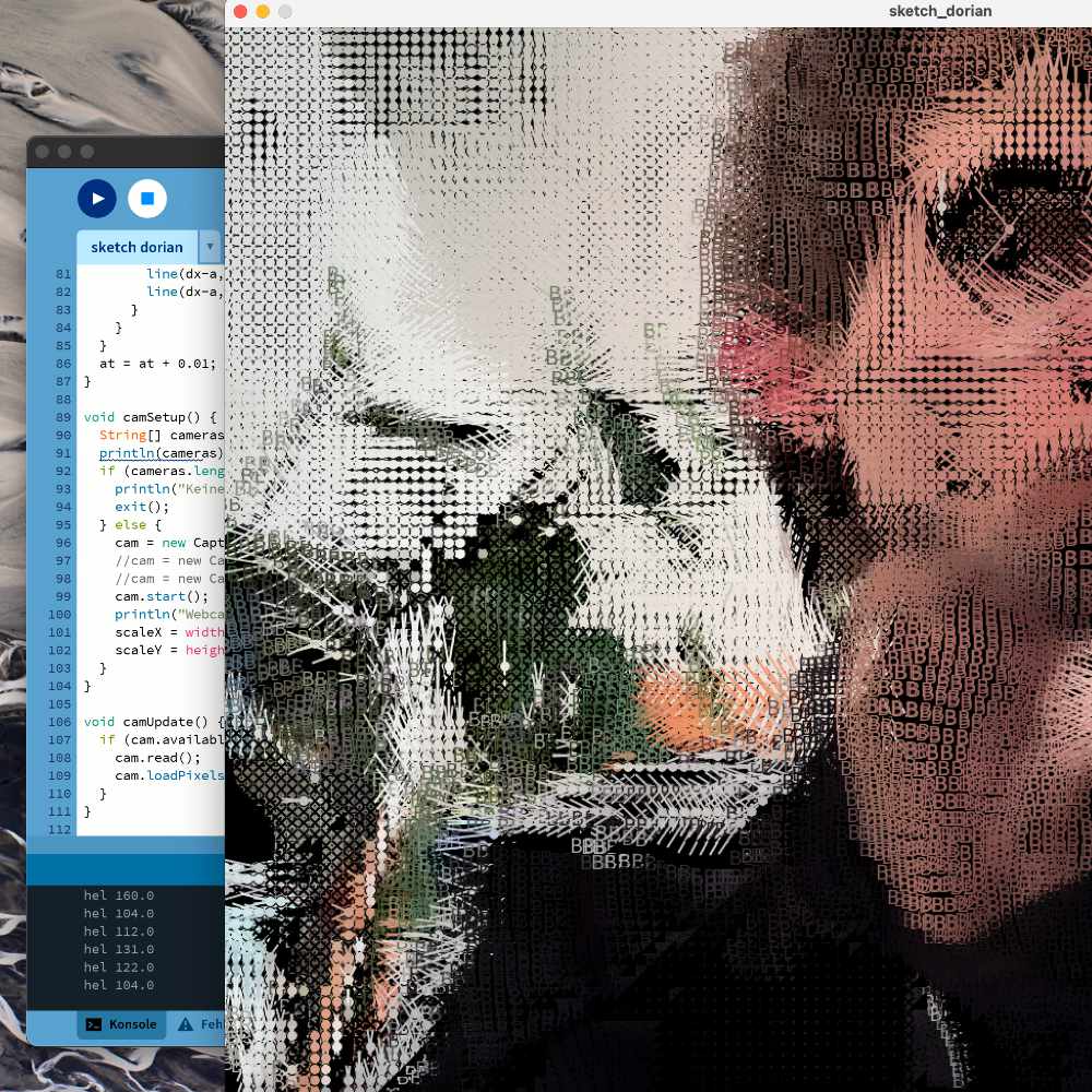 "Das Videobildnis des Dorian Gray" war der Titel dieses Kurses, bei dem es darum ging, mithilfe von Processing und Creative Coding einen sich ständig verändernden Live Kamera-Feed zu coden. Dieser sollte von unserem Laptop ausgehen und mit ASCII-Elementen, Farben und weiteren Effekten rumspielen. Ein Video davon findet ihr auf Instagram.