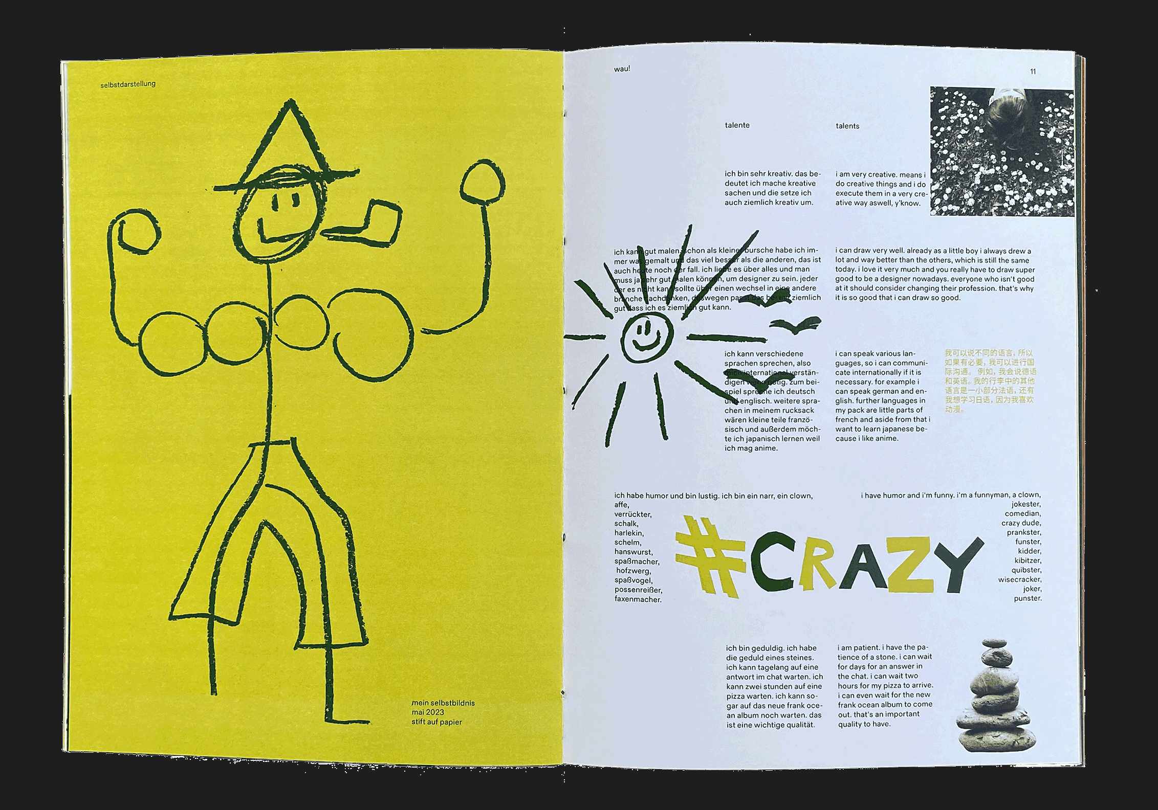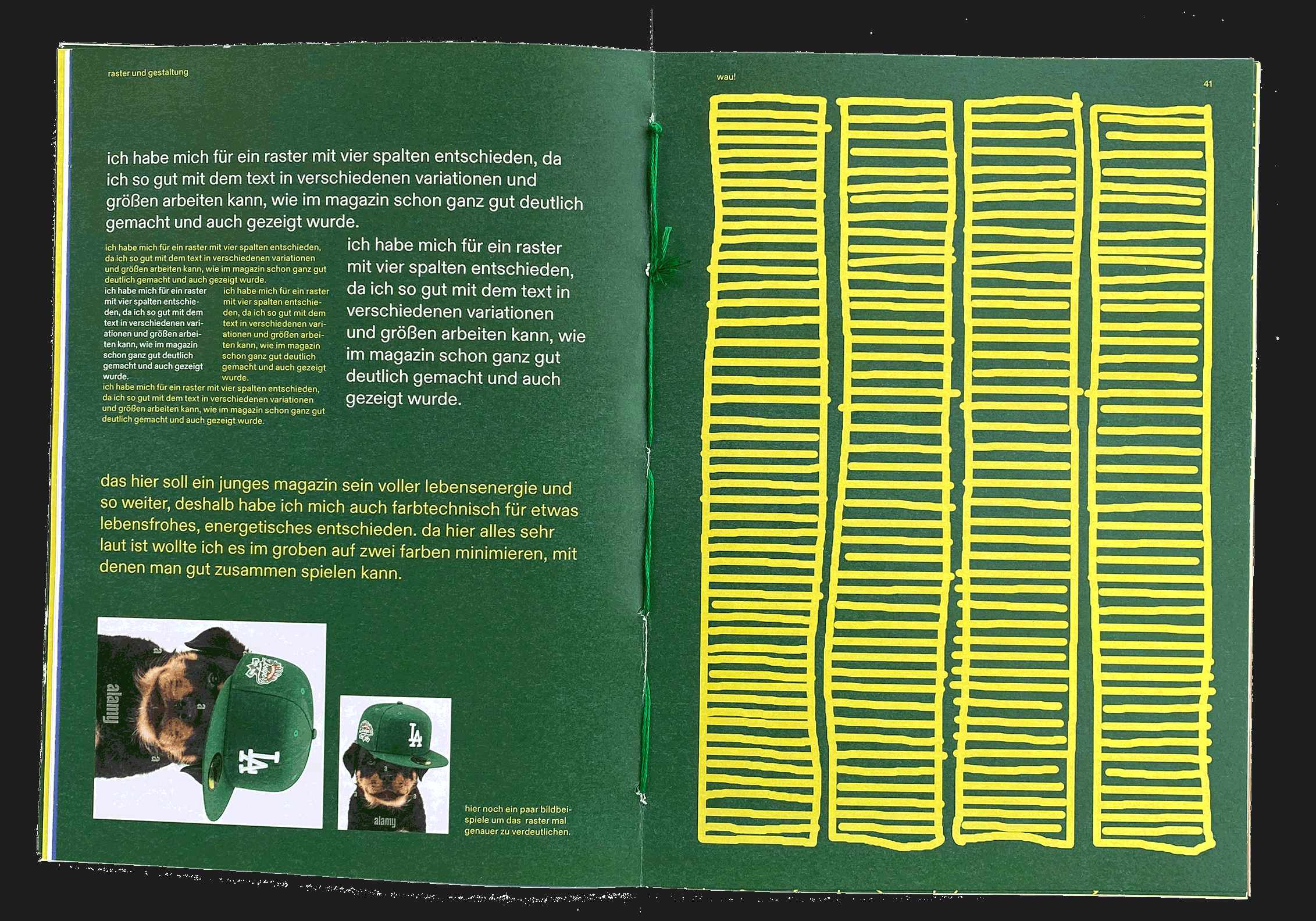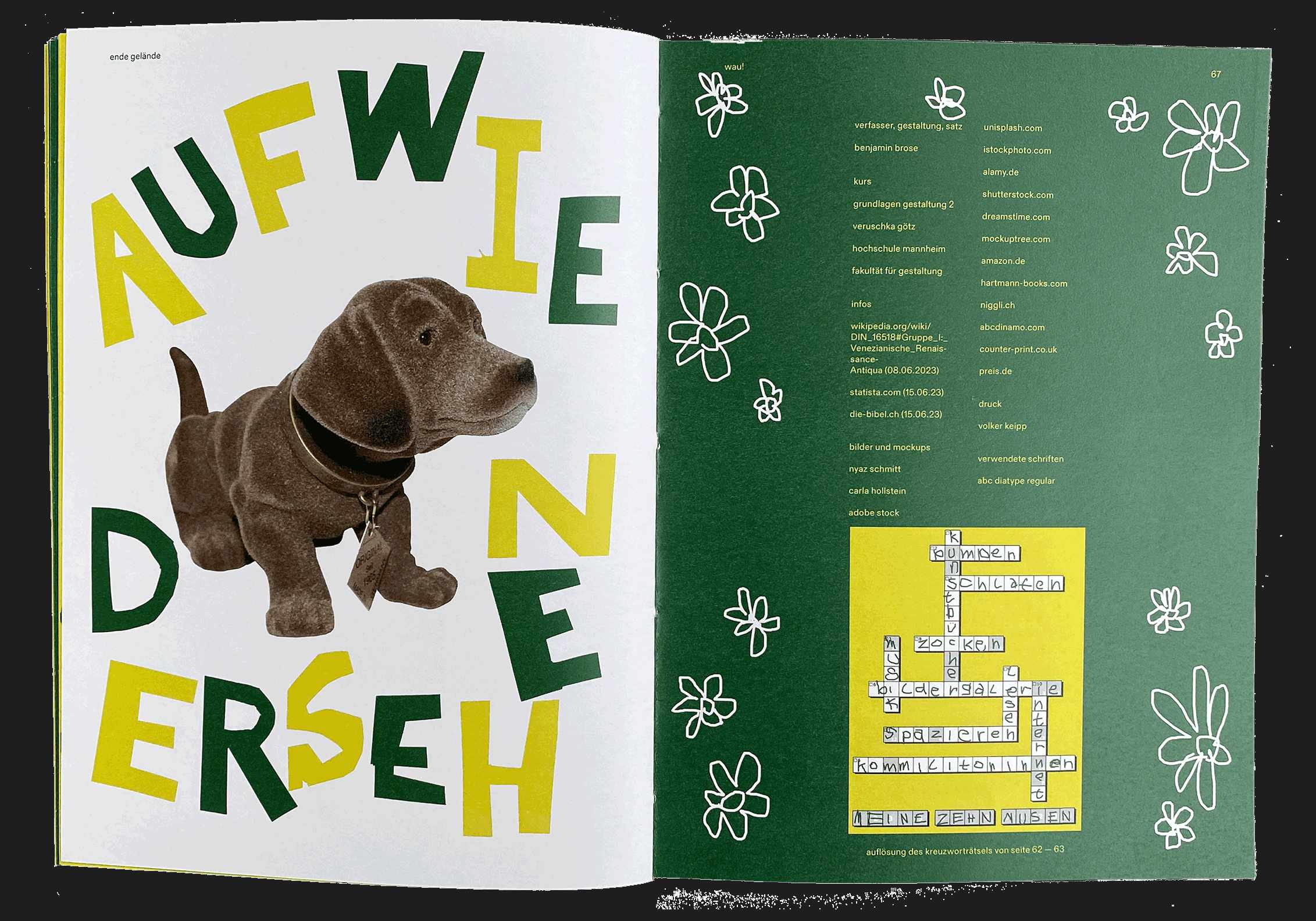 Bei diesem Magazin war unsere Aufgabe, uns freizumachen von den Gestaltungsrichtlinien, die wir das Semester über gelernt haben, und einfach kreativ zu sein. Auch hier hatten wir eine Liste mit Dingen, die im Magazin enthalten sein mussten, wie z.B. die Aufgaben aus den anderen Kursen des Semesters, eine Vorstellungsseite und so weiter. Wir hatten auch nicht viel Zeit und mussten wirklich schnell machen und das noch ganz am Ende des Semesters. Das war eines der spaßigsten Projekte bisher.